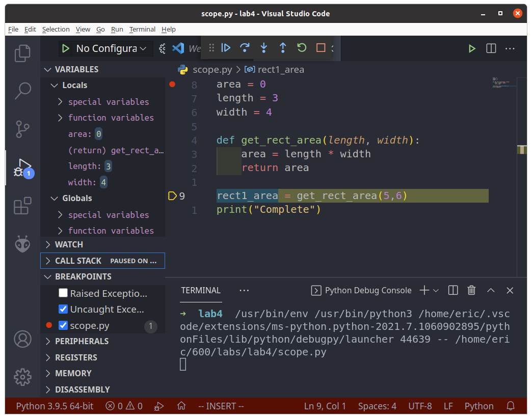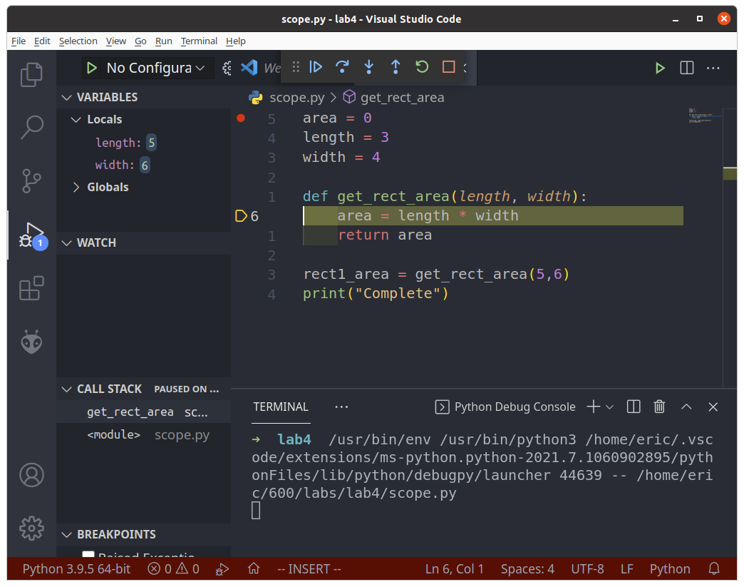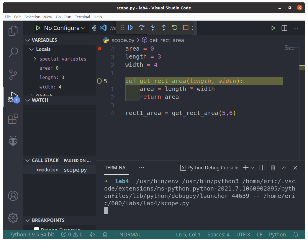 One confusing issue is that local and global variables can have the same name, but still be considered completely different variables with different values. To illustrate this, be sure to use VSCode to run the example below. Put a breakpoint on the line with area = 0 and step through the code as we demonstrated in the last lab.